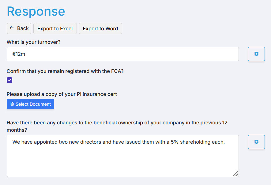 A centralised, version-controlled store for all your compliance documents. AI and LLM-powered querying automatically answers questionnaires and completes compliance returns using your stored policies.