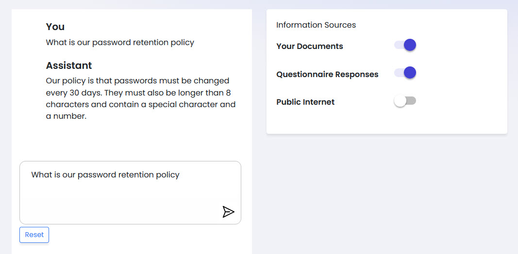 A centralised, version-controlled store for all your compliance documents. AI and LLM-powered querying automatically answers questionnaires and completes compliance returns using your stored policies.
